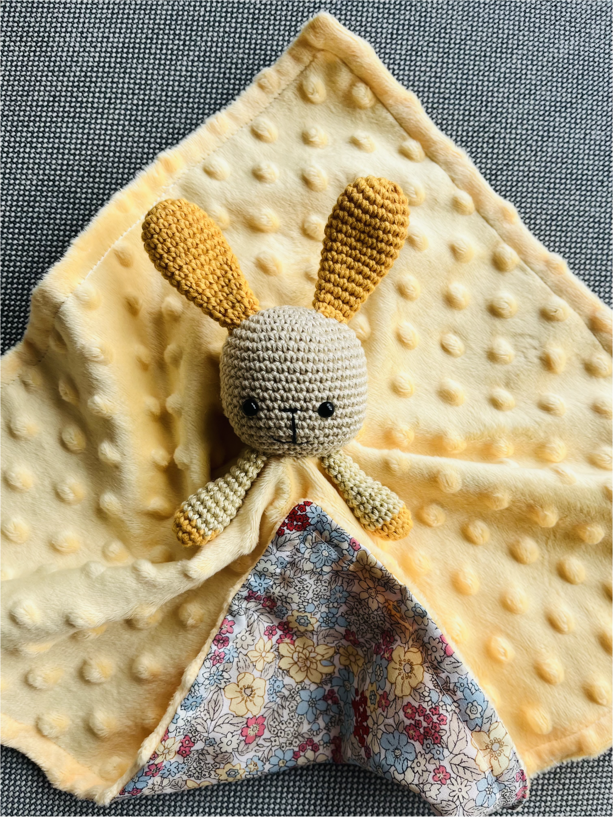 Käsitööna valmistatud kaisutekk on loodud pakkuma beebile soojust ja turvatunnet. Kaisutekk on valmistatud minki fliisist ja õrnast puuvillasest kangast, luues täiusliku kombinatsiooni. Teki mõõtmed on 35×35 cm. Jänku pea on heegedatud puuvillase lõngaga ja täidetud kaerakiuga. Turvasilmad tagavad, et toode on beebidele ohutu.