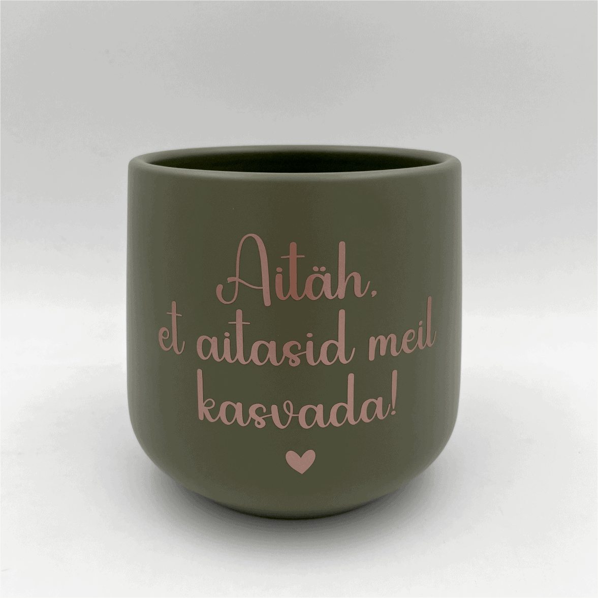 Lillepotil sõnum „Aitäh, et aitasid mul/meil kasvada“, millele saad lisada personaalse teksti: näiteks nime, lasteaia rühma või klassi nime. Kirja trükime vastupidava veekindla vinüülkleebisena.
