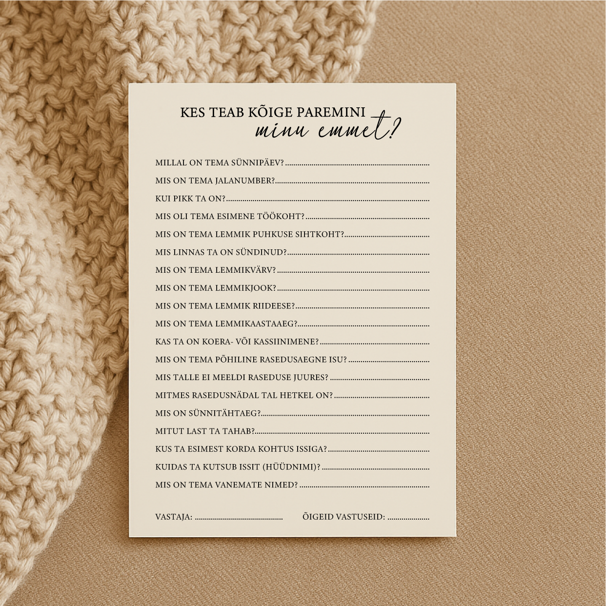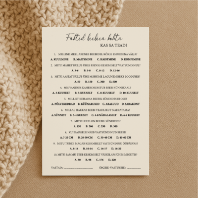 Selleks, et luua erilisi mälestusi koos oma kõige lähedasemate inimeste seltsis, oleme loonud lõbusad ja kaasahaaravad beebipeo mängukaardid, mida koos tulevase emmega koos mängida! Tegelikult ju ongi tähtis ühiselt veedetud aeg ja mälestuste loomine, mida on tulevasel emal hea meenutada ka vanaduspõlves.