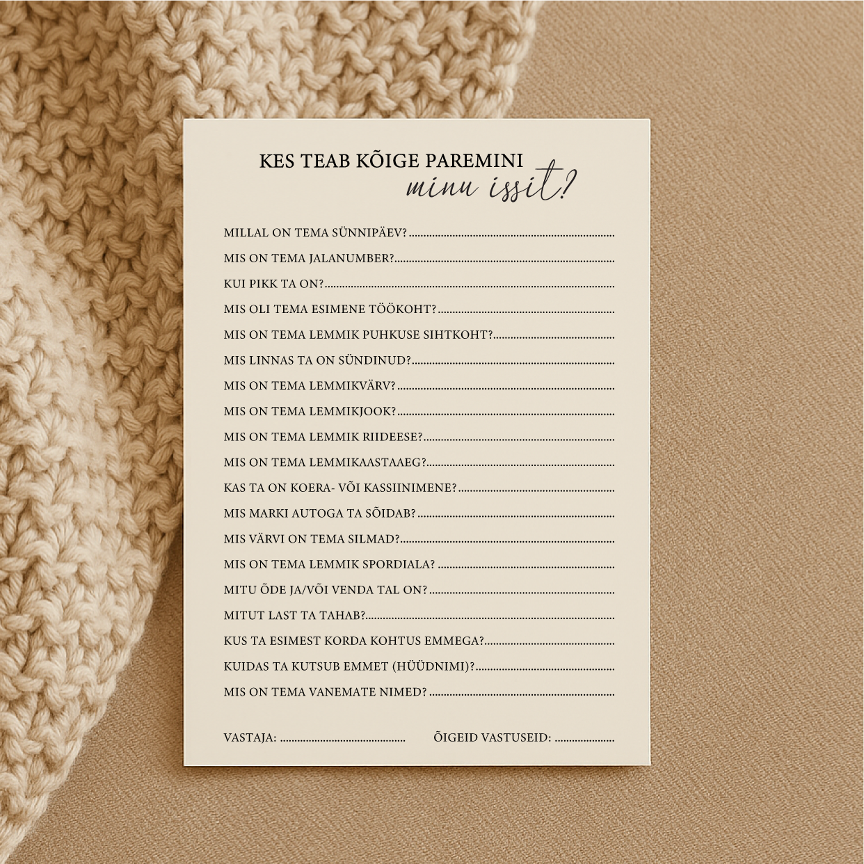 Beebipeo mängukaartidel “Kes teab minu issit” on lihtsad ja elulised küsimused tulevase isa kohta. Küsimused hõlmavad tema lapsepõlve, hobisid, eelistusi jm. Külalistel on ülesanne vastata nendele küsimustele oma teadmiste kohaselt, võisteldes omavahel selle nimel, kes tunneb tulevast isa kõige paremini.