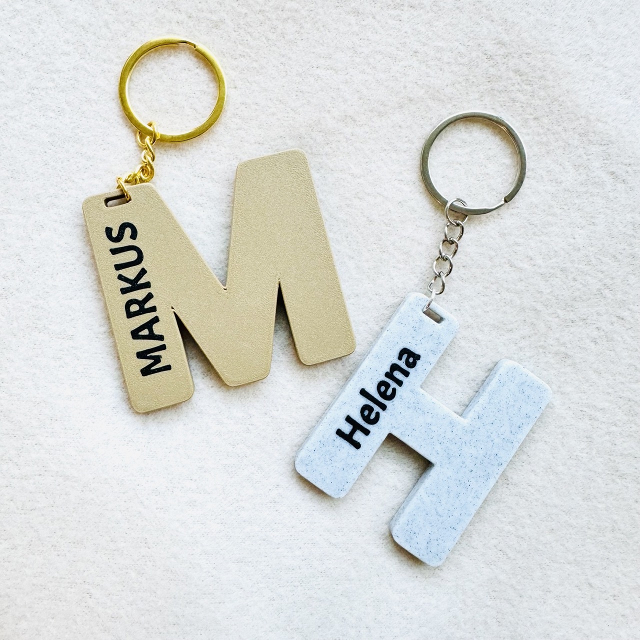 Vastupidav 3D prinditud nimesilt lapse nimega, mille kõrgus on 60 mm ja paksus 5 mm. Suure tähe laius sõltub nimetähest. Tekst on trükitud ja silt kinnitub võtmehoidja rõngaga. Täiuslik aksessuaar, et lisada isikupära seljakotile või muudele esemetele.
