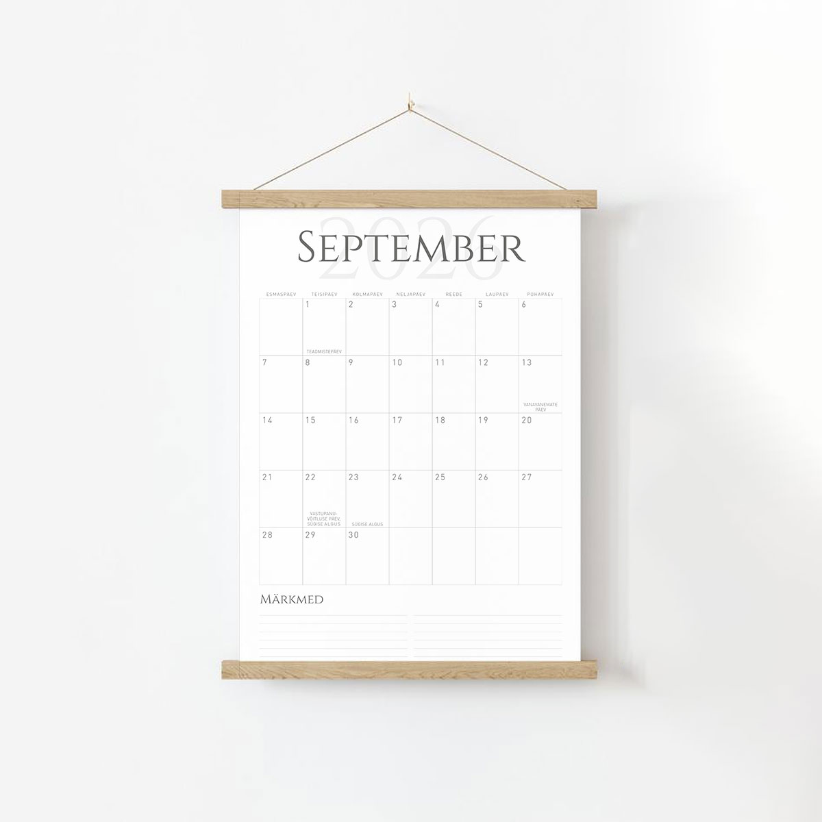 - Puidust riputusliist: Soovi korral saate tellida kauni ja stiilse puidust riputusliistu, mis lihtsustab kalendri ülesriputamist ja lisab teie kodule hubasust. Liistud on kergesti paigaldatavad.