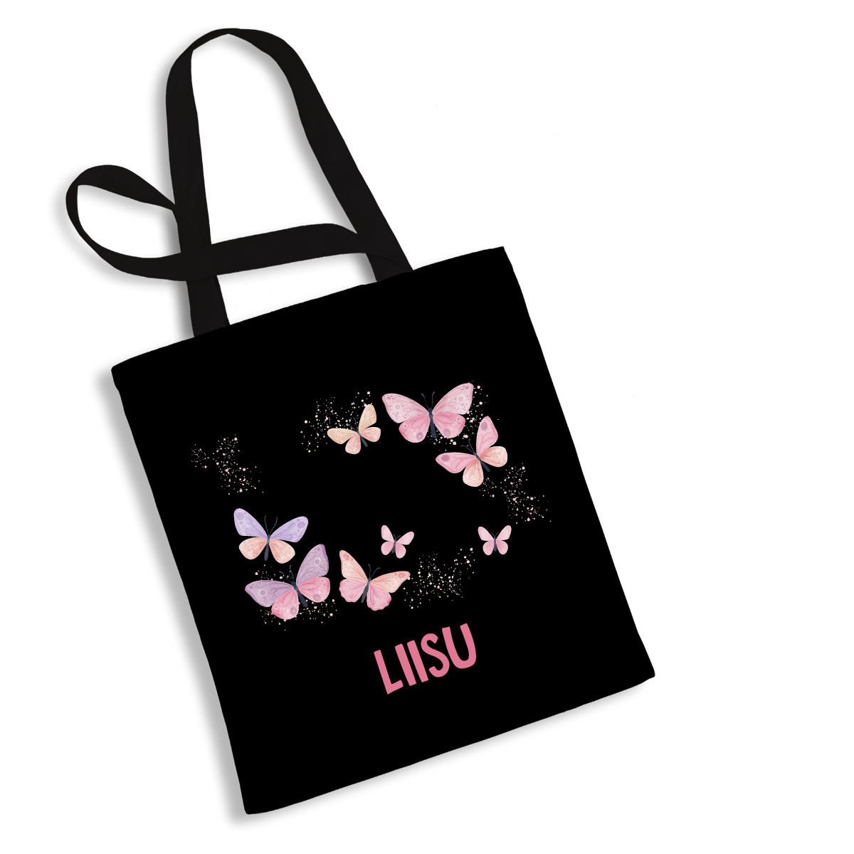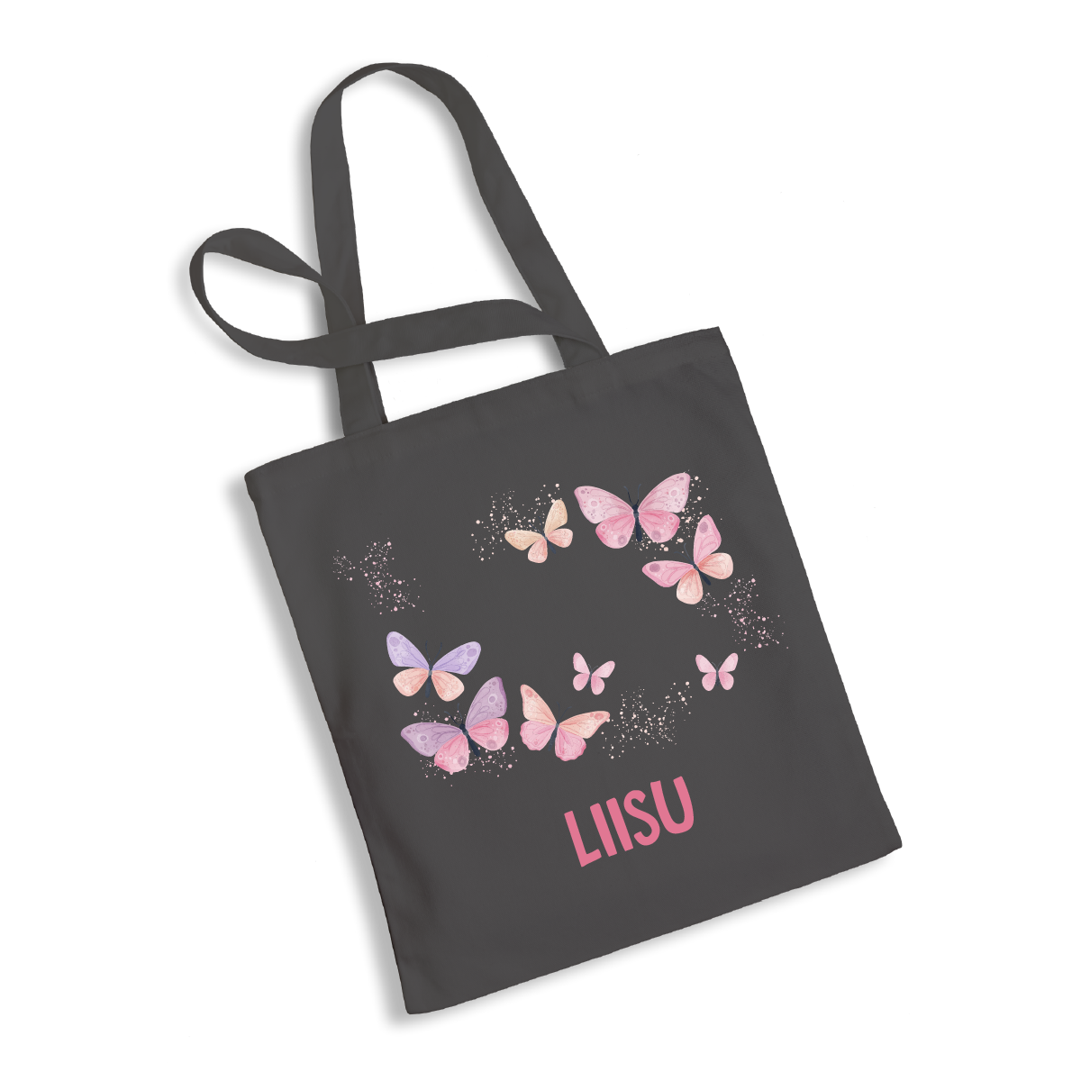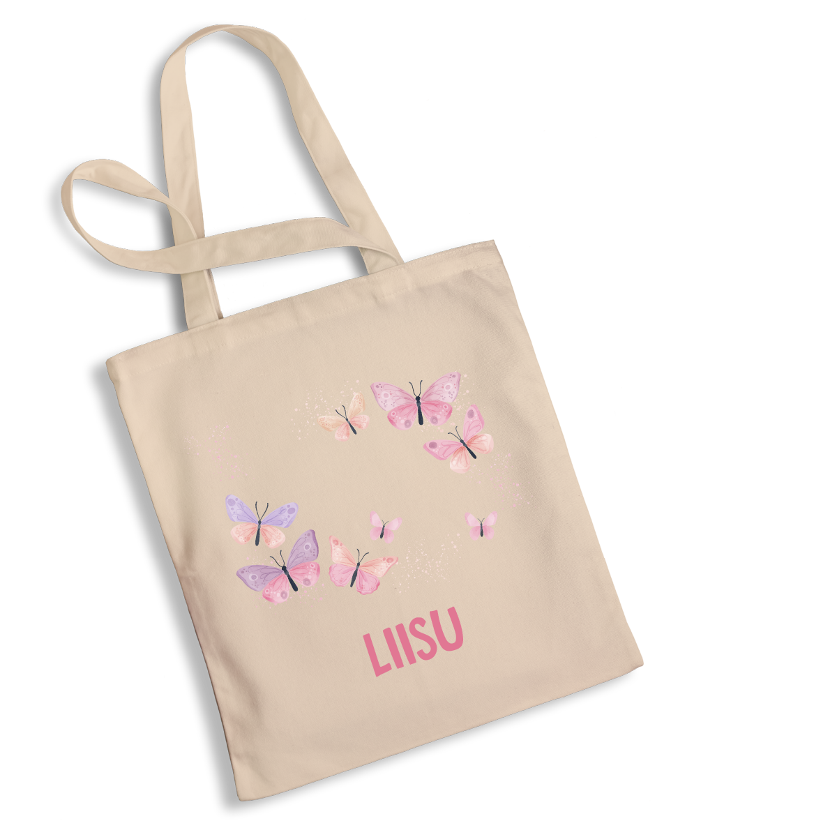 Armas ja tugev riidest kott laste vahetusriiete või mänguasjade jaoks. Valmistatud 100% orgaanilisest puuvillast, pikkade sangadega. Kaunistatud rõõmsate loomade või liblikatega – saad lisada ka lapse nime!