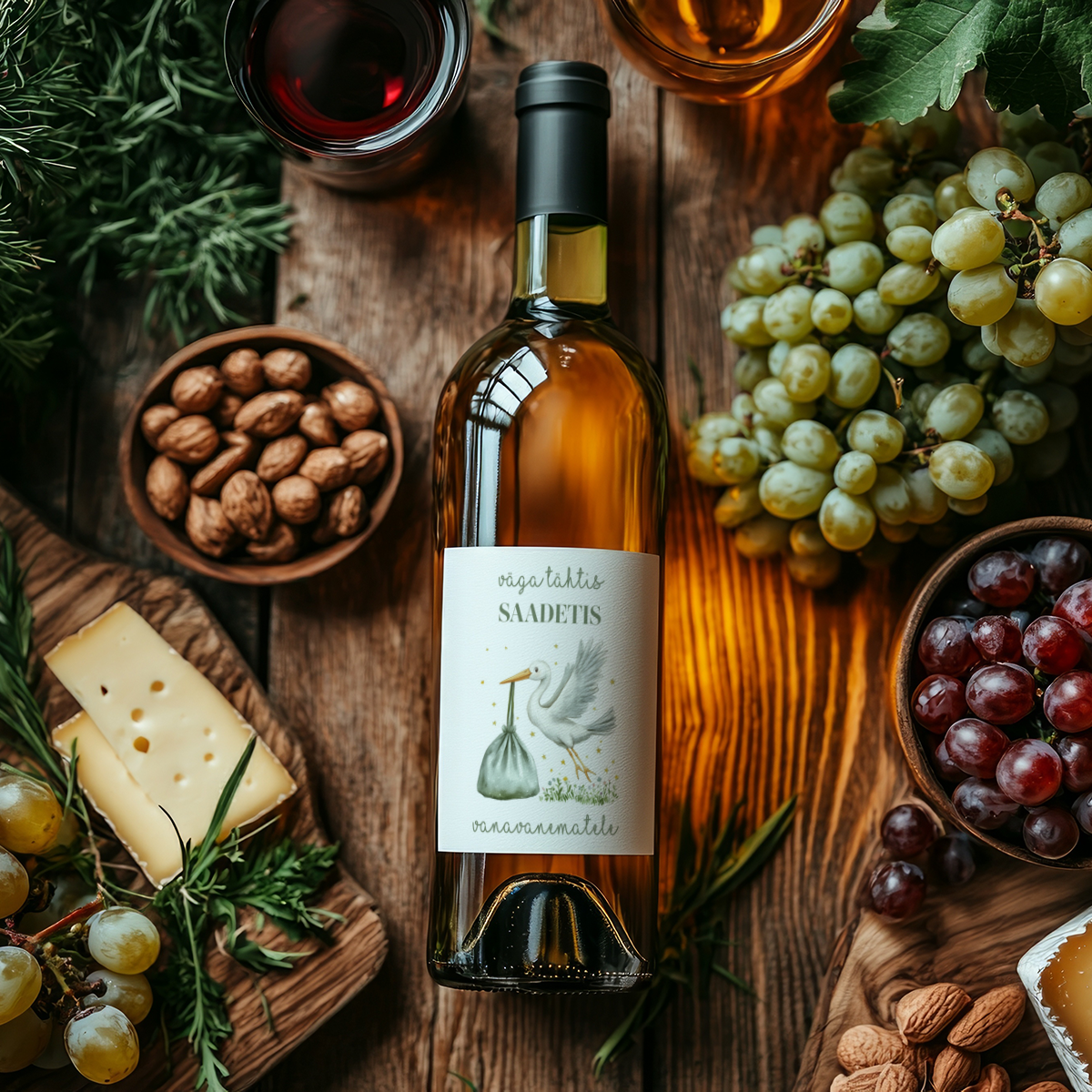 Tee lapseootuse uudis meeldejäävaks! Meie veinipudeli etiketid on ideaalne viis vanematele, vanavanematele ja sõpradele rõõmusõnumi edastamiseks. Kvaliteetsed ja niiskuskindlad sildid on saadaval valmiskujundustega või personaliseerituna – lisa nimed, kuupäevad või südamlik sõnum. Lihtne paigaldada ja eemaldada, sobib enamikele veinipudelitele.